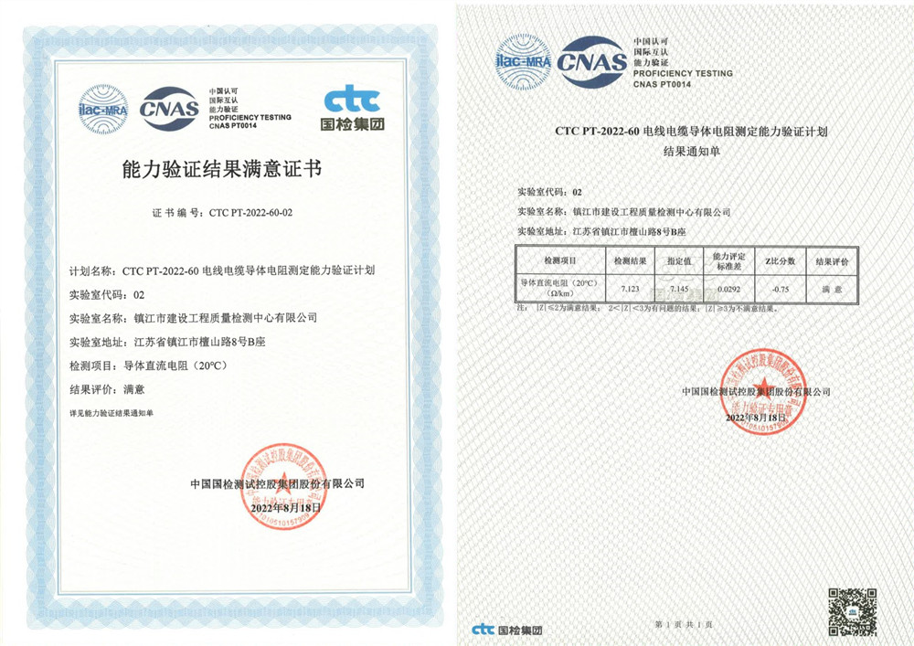 PT-2022-60电线电缆导体电阻测定”能力验证,2022年8月收到能力验证结果通知单,我中心提交的检测结果评价为“满意”。