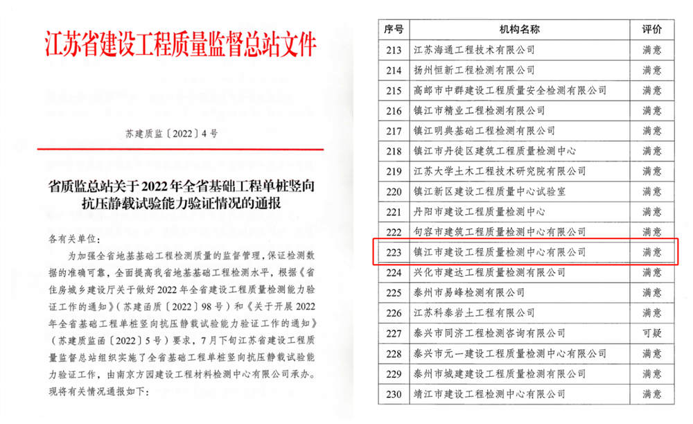 检测中心地基所于2022年7月26月参加了由江苏省建设工程质量监督总站组织实施的全省基础工程单桩竖向抗压静载试验能力验证,本次能力验证结果为满意,顺利通过了此次能力验证。