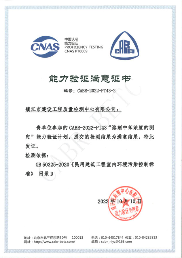 今年7月份,检测中心参加了由CNAS组织建研院检测中心有限公司实施的“溶剂中苯浓度的测定”的能力验证。近日,我中心收到评价结果,其结果为“满意”(Z比分数:0.11)。