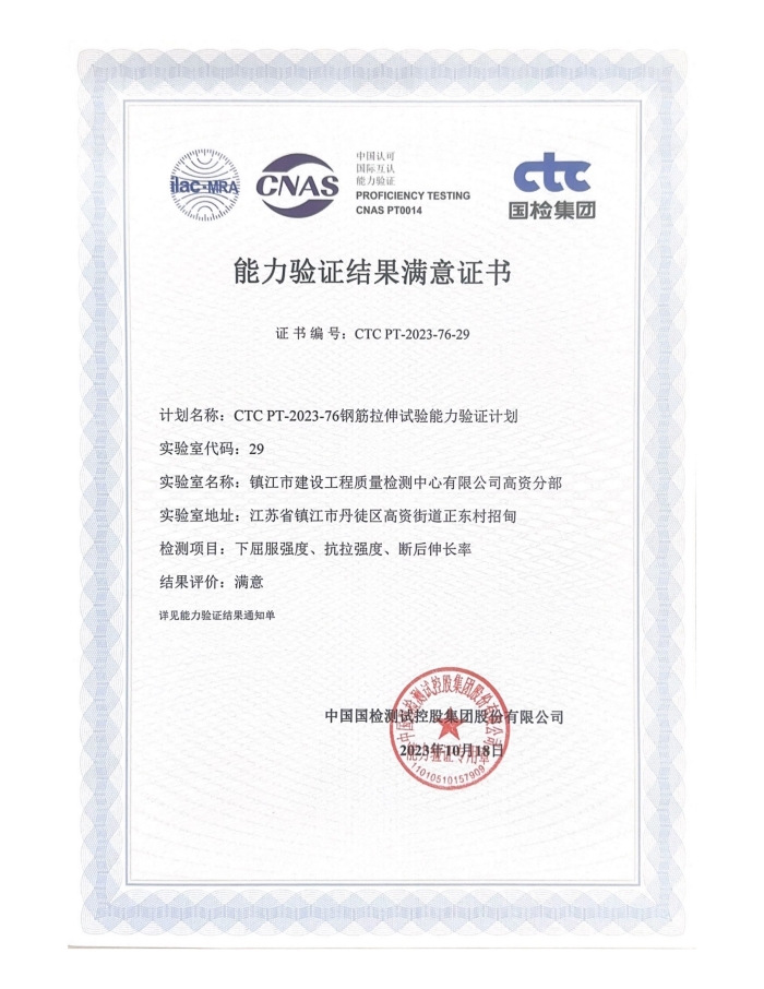 2023年08月04日,检测中心高资分部参加了由中国国检测试控股集团股份有限公司组织的钢筋拉伸试验能力验证计划(CTC PT-2023-76-29)。