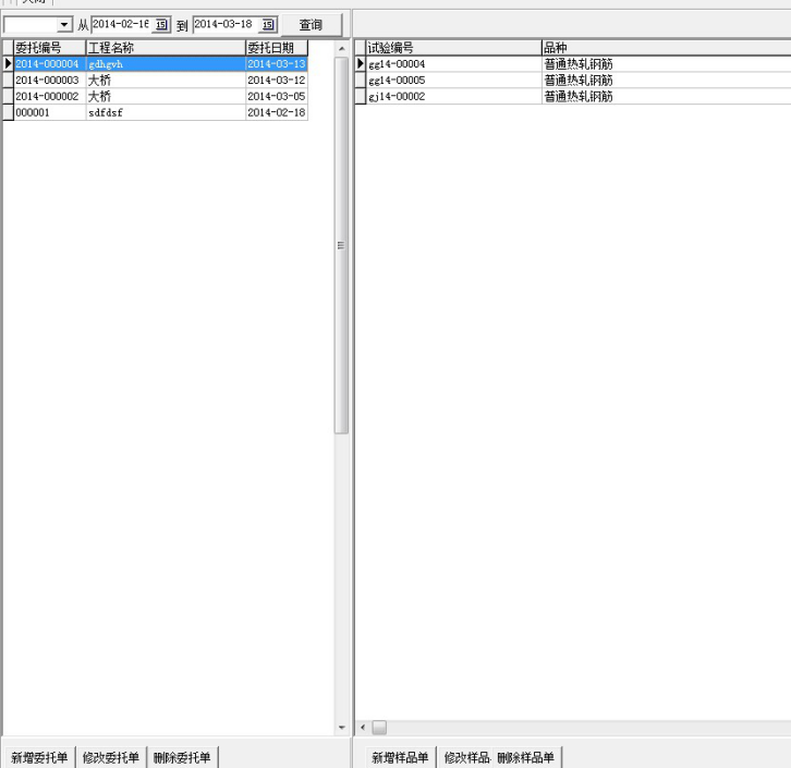 委托编号自动生成,不需要做处理,进入这个界面会默认带入一个工程的信息,如果不是所需要的工程,可以在“工程名称”的下拉里选择所需要的工程名称或者手工输入。如果有分项工程,请填入,没有就空着,确认信息无误后,点“存盘退出”,这样一个委托单就生成了,可以在图5的界面上看到新建的委托编号,委托编号新建完成后,点击“新建样品单“按钮,新建样品单,进入图7。