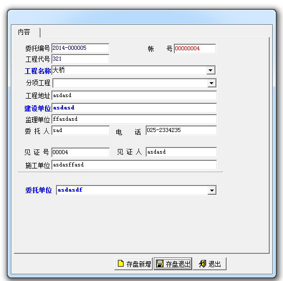 信息根据具体情况填写,其中“账号”、“工程名称”、“委托单位”、“建设单位”必须填写,确认信息无误后点下方的“存盘退出”, 这样工程就新建好了。可以委托样品了。编号后缀一般情况下不需要改动,默认选择”A”就可以。